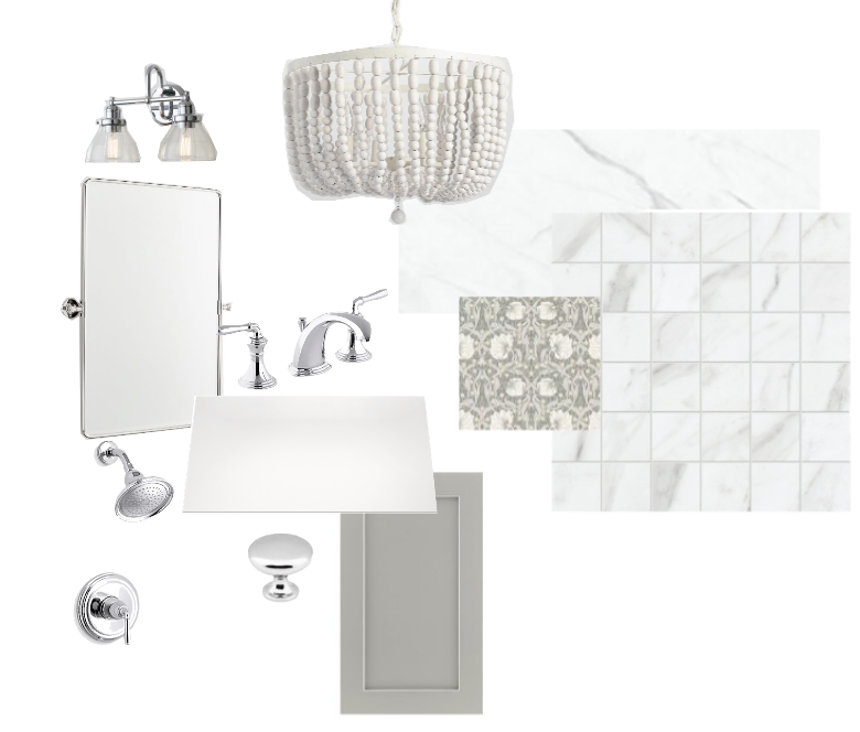 Recommendations may include counters, flooring (wood/tile/carpet), cabinets, hardware, mirrors, bath finishes, light fixtures, faucets/sinks, paint, backsplash, range hood, etc.